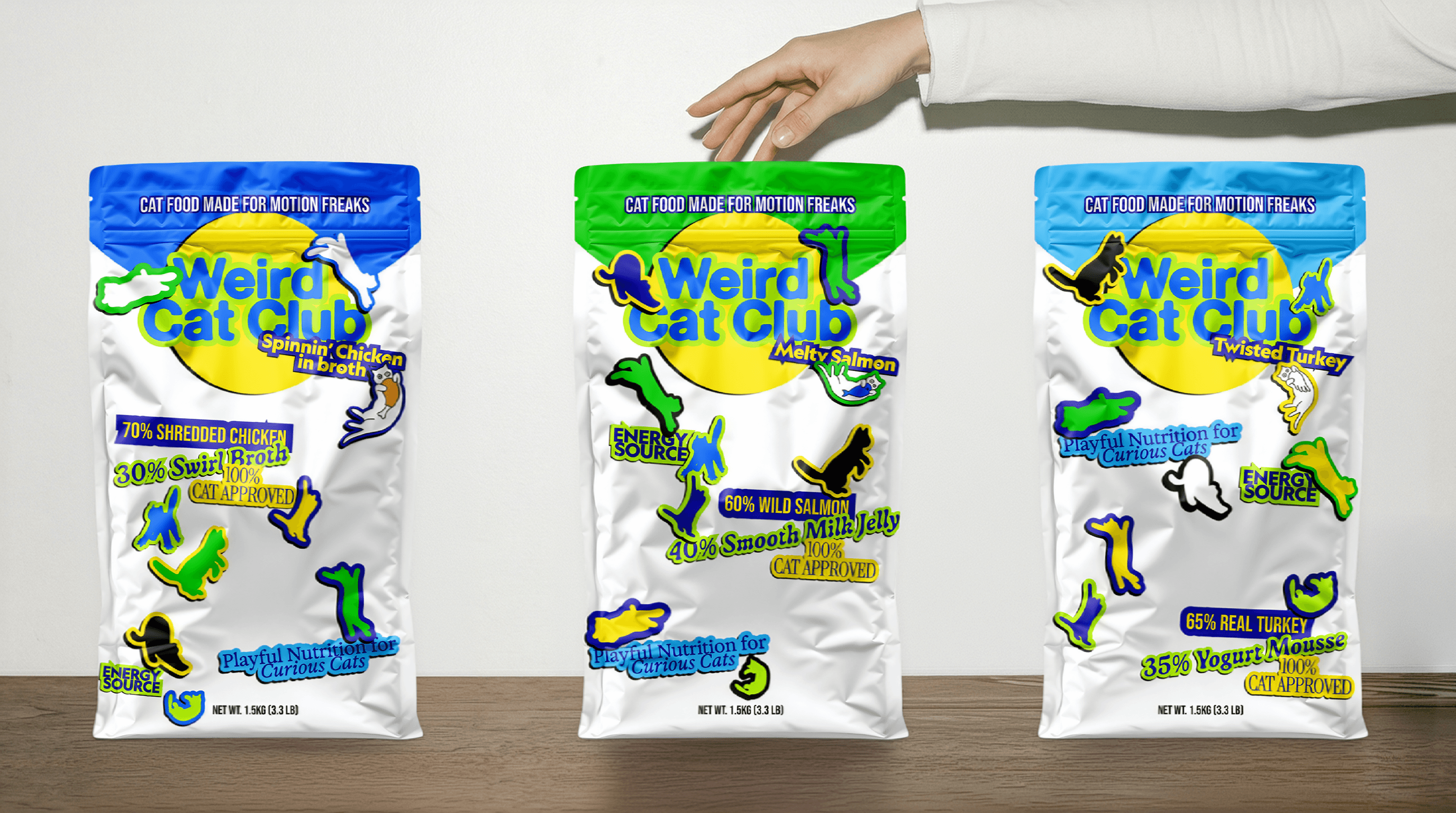 In Weird Cat Club, developing a consumer goods brand for cats. Embracing a worldview shaped by the true identity of cats, their strangeness, unpredictability, and exaggerated behavior. The brand actively welcomes chaos, repetition, and imperfection, celebrating individuality through a playful system that resists conventional pet brand aesthetics.